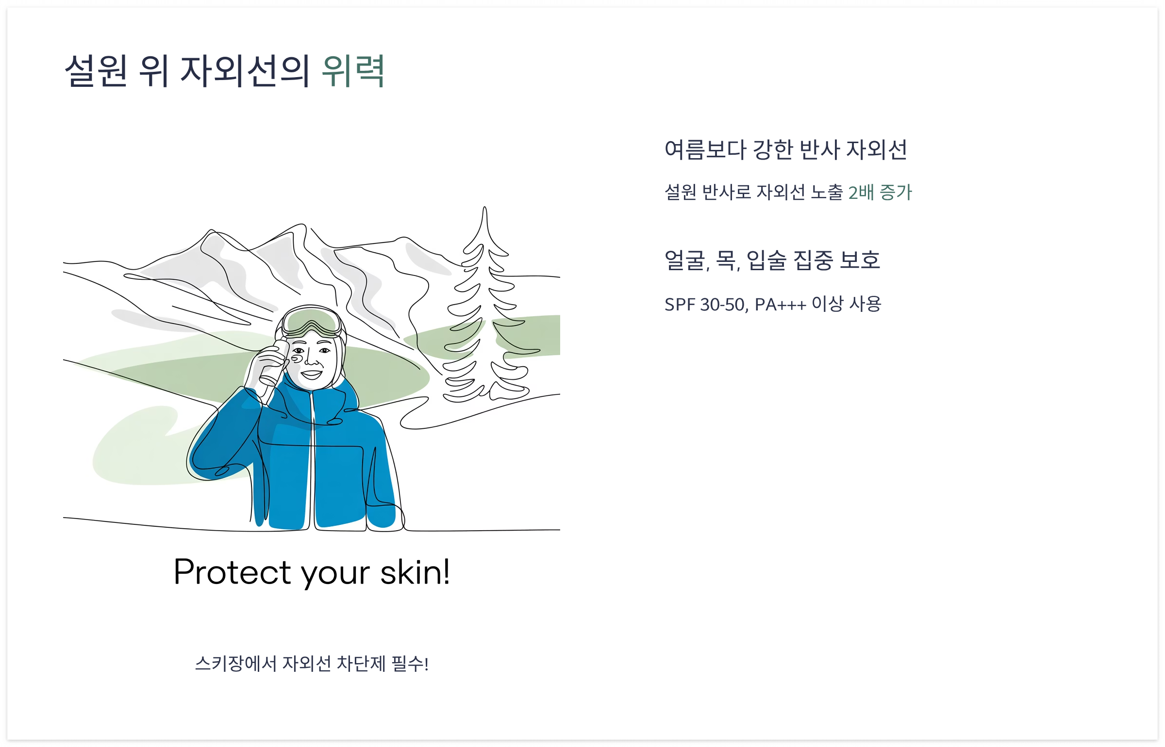 하지만 겨울철 설원은 자외선과 건조함이 동시에 강력하게 작용하는 환경입니다.