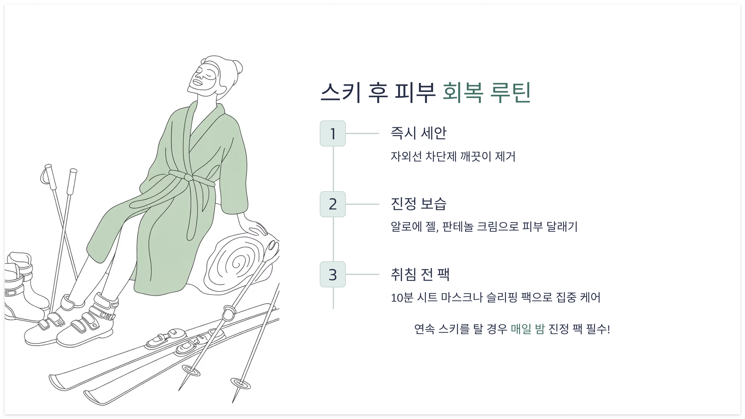 특히 연속으로 스키를 탈 경우, 하루 10분 정도의 팩만으로도 피부 컨디션 유지에 큰 차이가 납니다.
