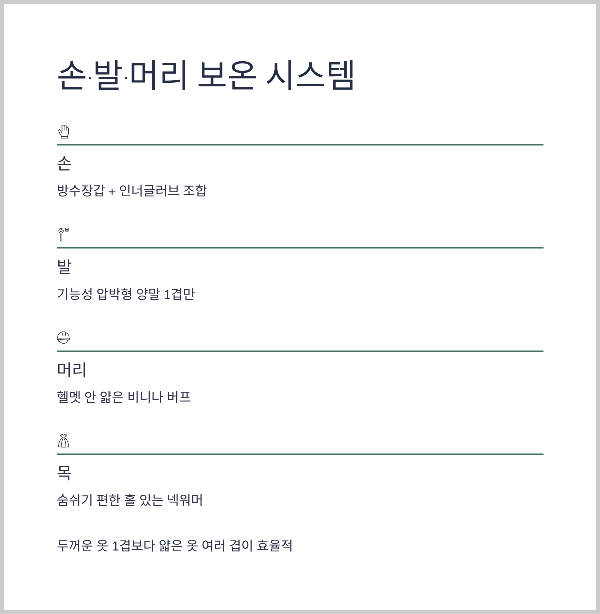 Tip: 두꺼운 옷보다 얇은 옷 여러 겹이 체온 유지에 훨씬 효율적입니다.