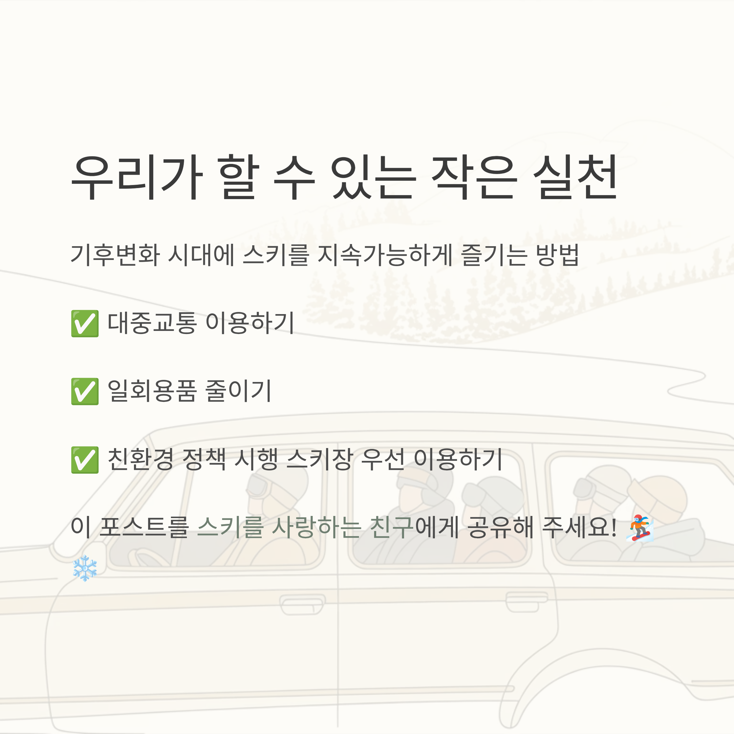 앞으로의 스키 산업은 단순히 슬로프를 유지하는 차원을 넘어, 환경과 공존하는 지속 가능성을 확보해야만 합니다. 스키어 개개인의 작은 실천이 모여 겨울 스포츠의 미래를 지킬 수 있습니다.