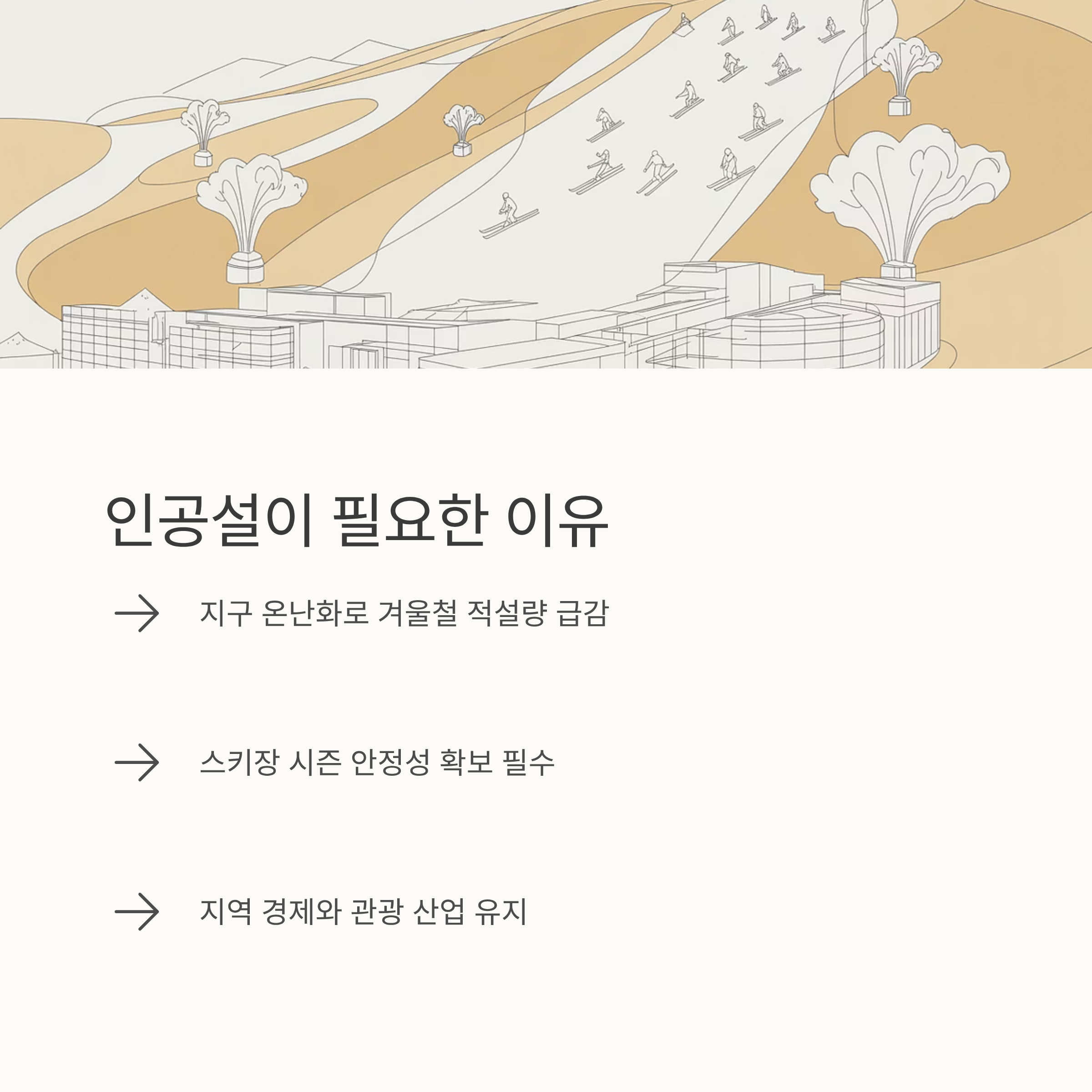 스키장은 매년 정해진 시기에 개장해야 하고, 안정적인 슬로프 상태를 유지해야 합니다. 이를 위해 인공설은 사실상 필수 요소가 되었습니다. - 관광 산업 유지