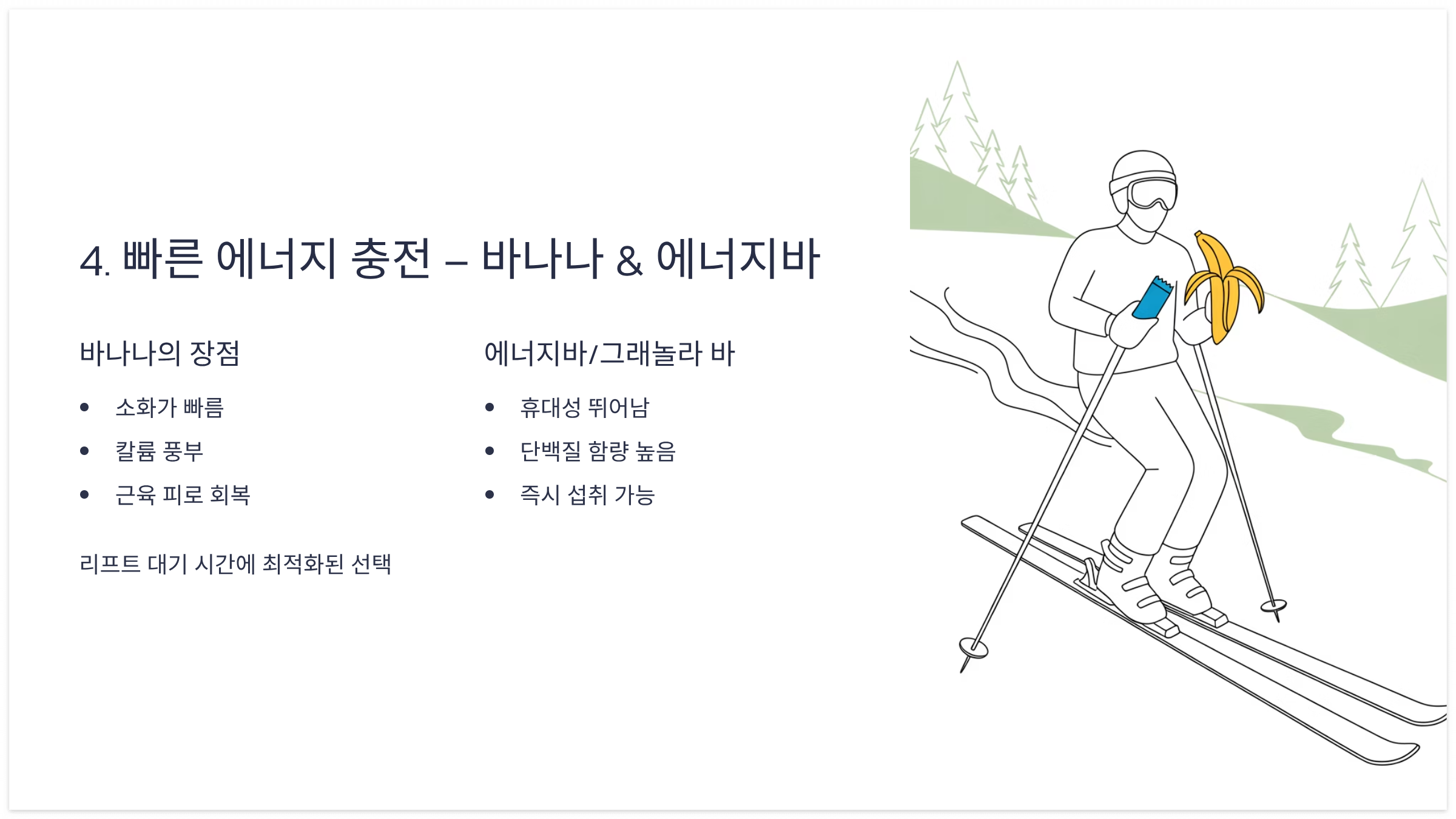 특히 스키장은 추운 환경, 장시간 활동, 그리고 리프트 대기까지 겹쳐 많은 에너지를 소모합니다.