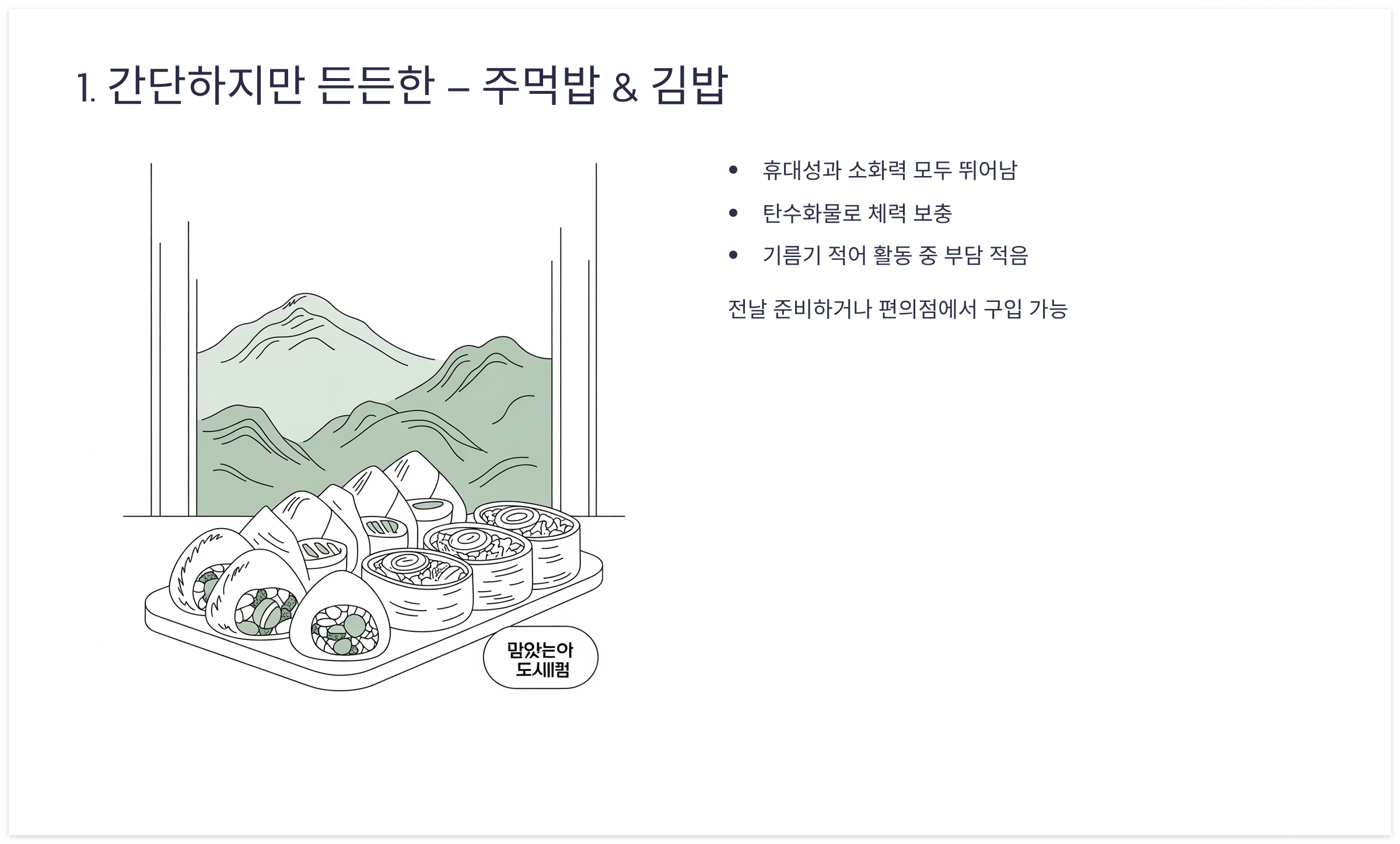 - 주먹밥이나 김밥은 휴대성과 소화력 모두 뛰어난 대표 메뉴입니다.
