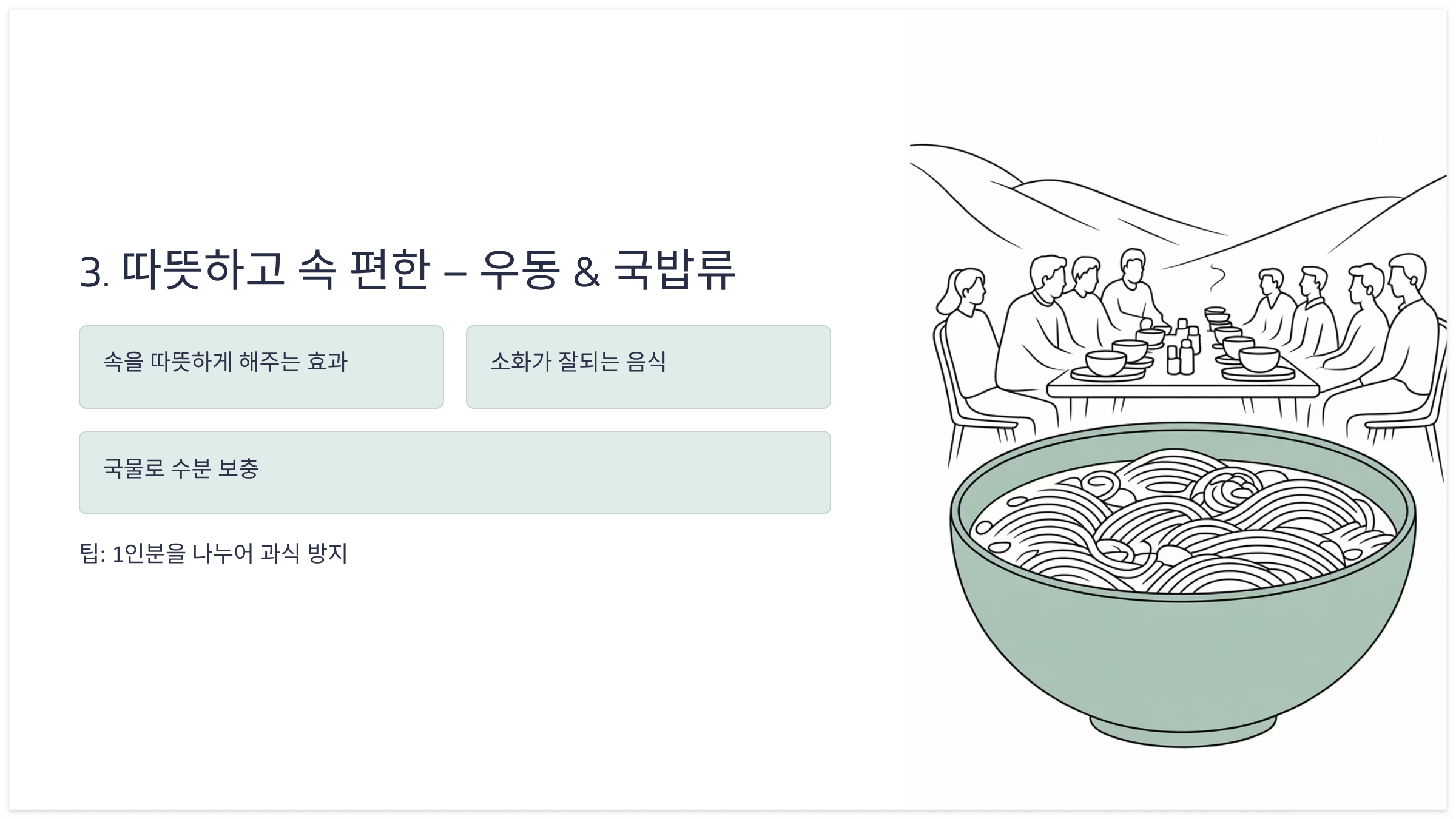 - 우동, 칼국수, 국밥류는 속을 따뜻하게 하고 소화가 잘 되는 음식입니다.