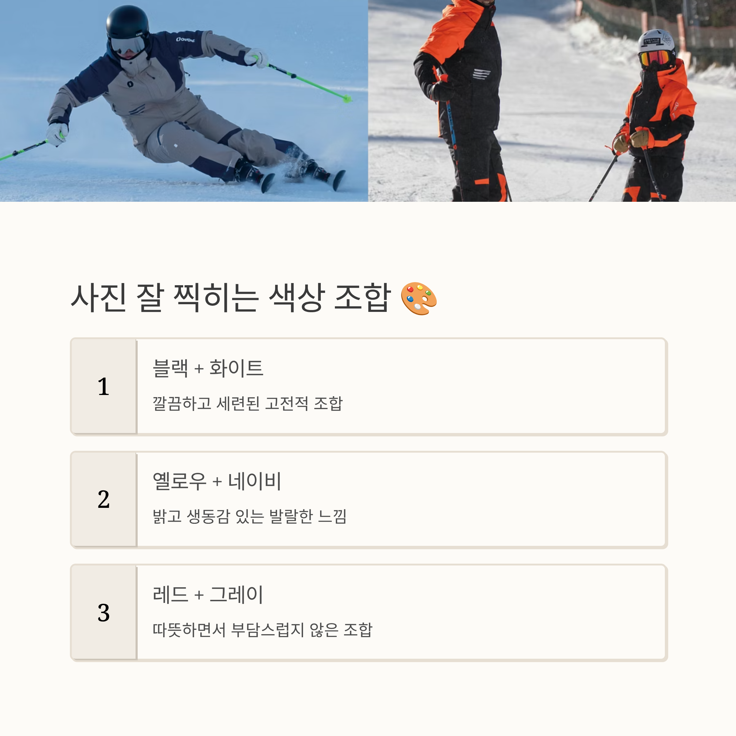 많은 사람들이 스키장에 가면 “어떤 색을 입어야 잘 어울릴까?”, “스키어답게 보이려면 어떻게 코디해야 할까?”라는 고민을 합니다.