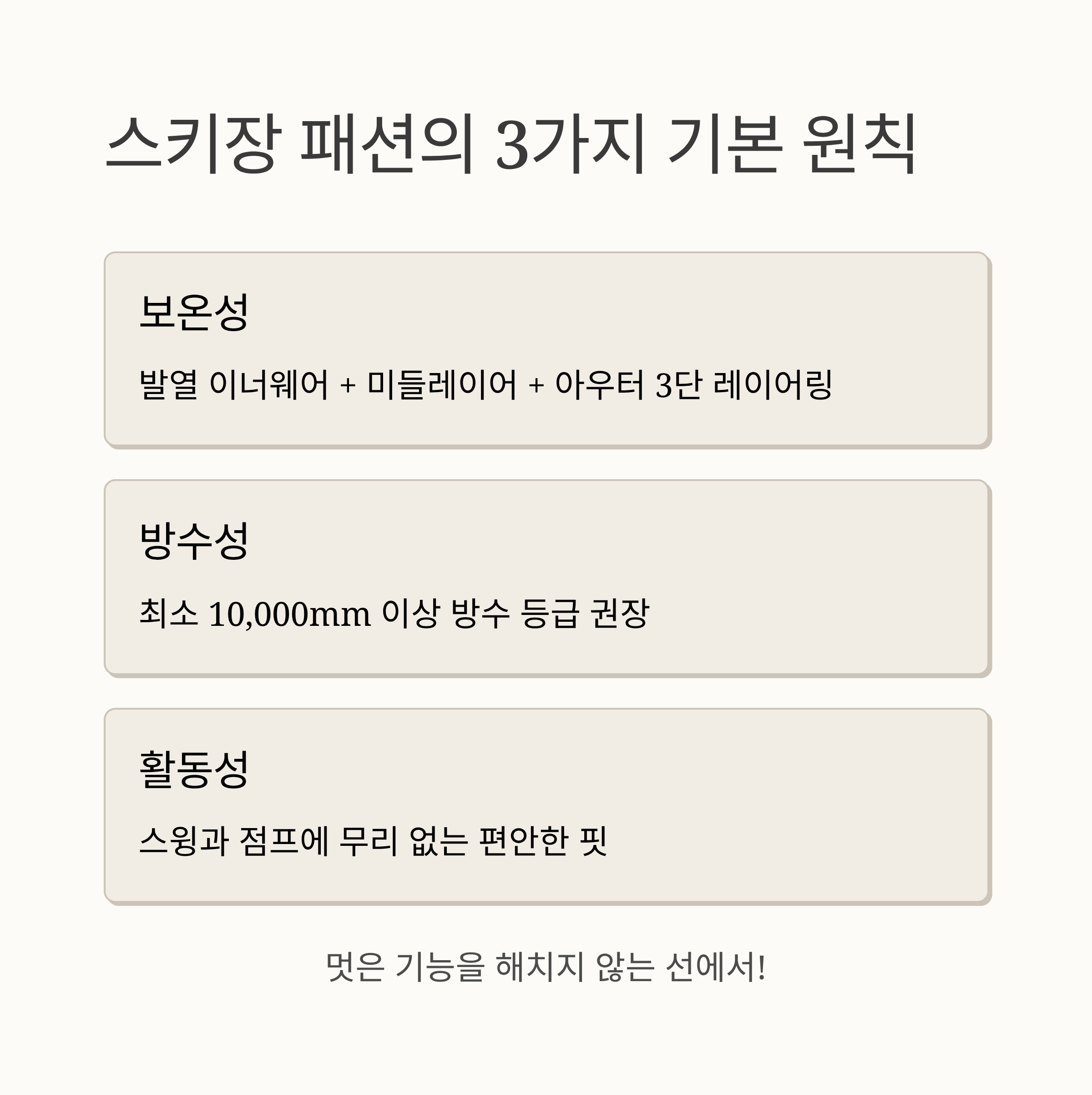 - 보온성: 발열 이너웨어 + 미들레이어(후리스·패딩) + 아우터(스키복)의 3단 레이어링