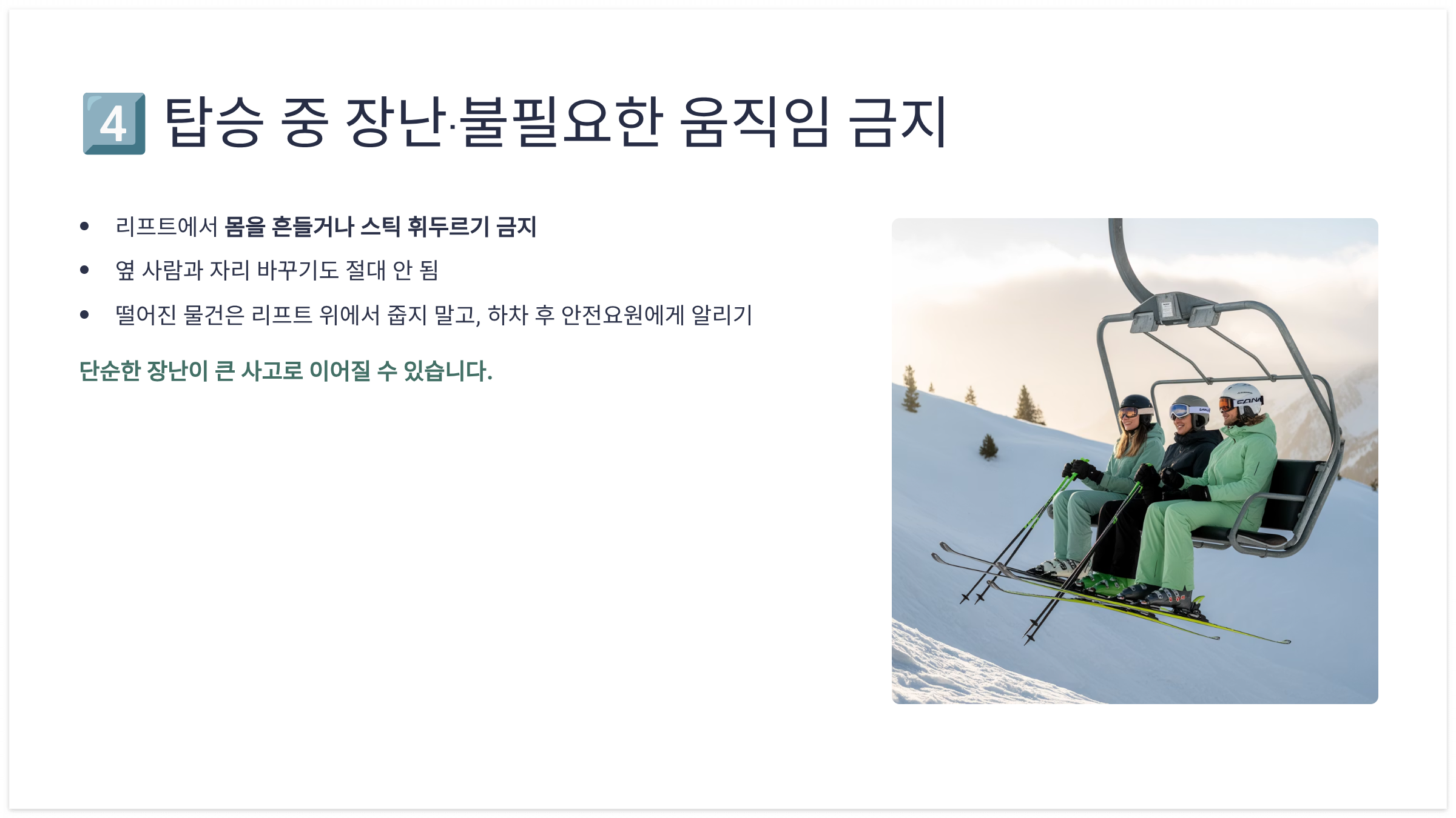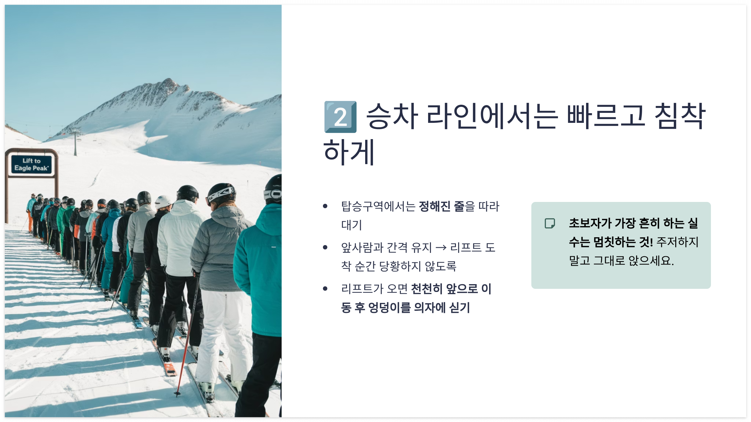 - 앞사람과 간격 유지 → 리프트 도착 순간 당황하지 않도록