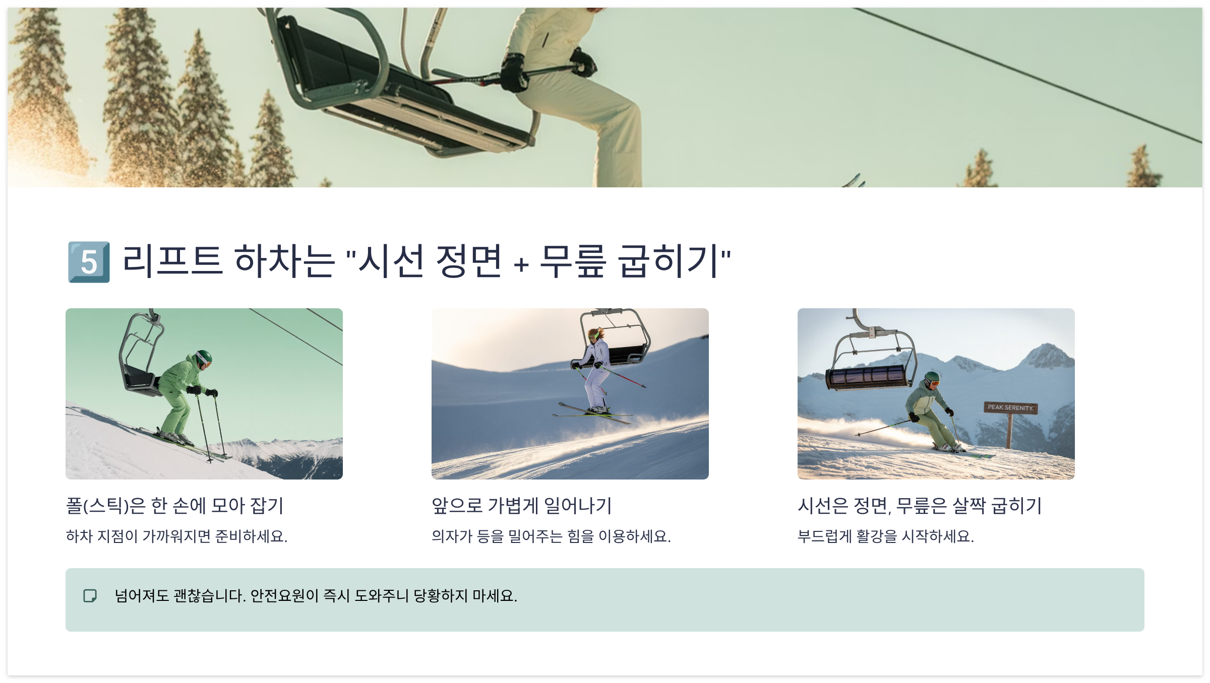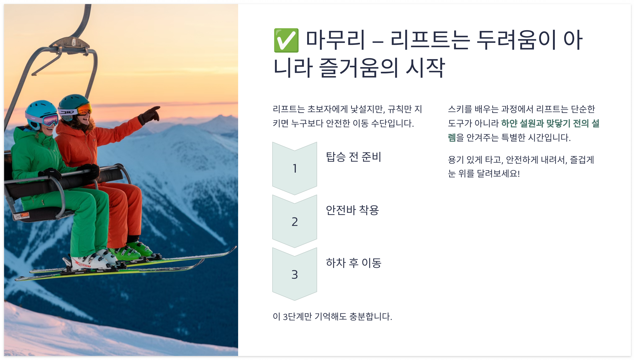 리프트는 초보자에게 낯설지만, 규칙만 지키면 누구보다 안전한 이동 수단입니다.