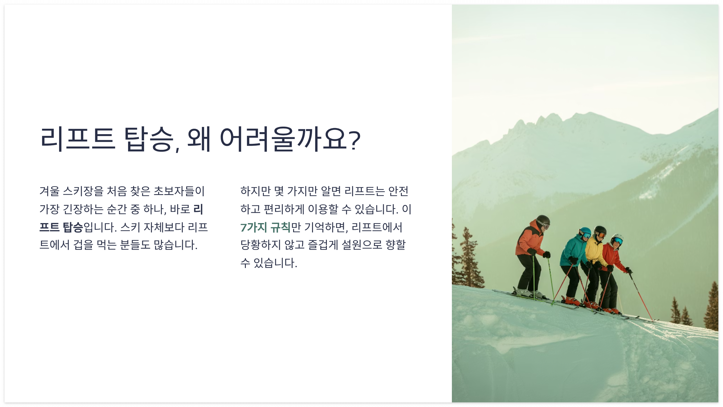 겨울 스키장을 처음 찾은 초보자들이 가장 긴장하는 순간 중 하나, 바로 리프트 탑승입니다.