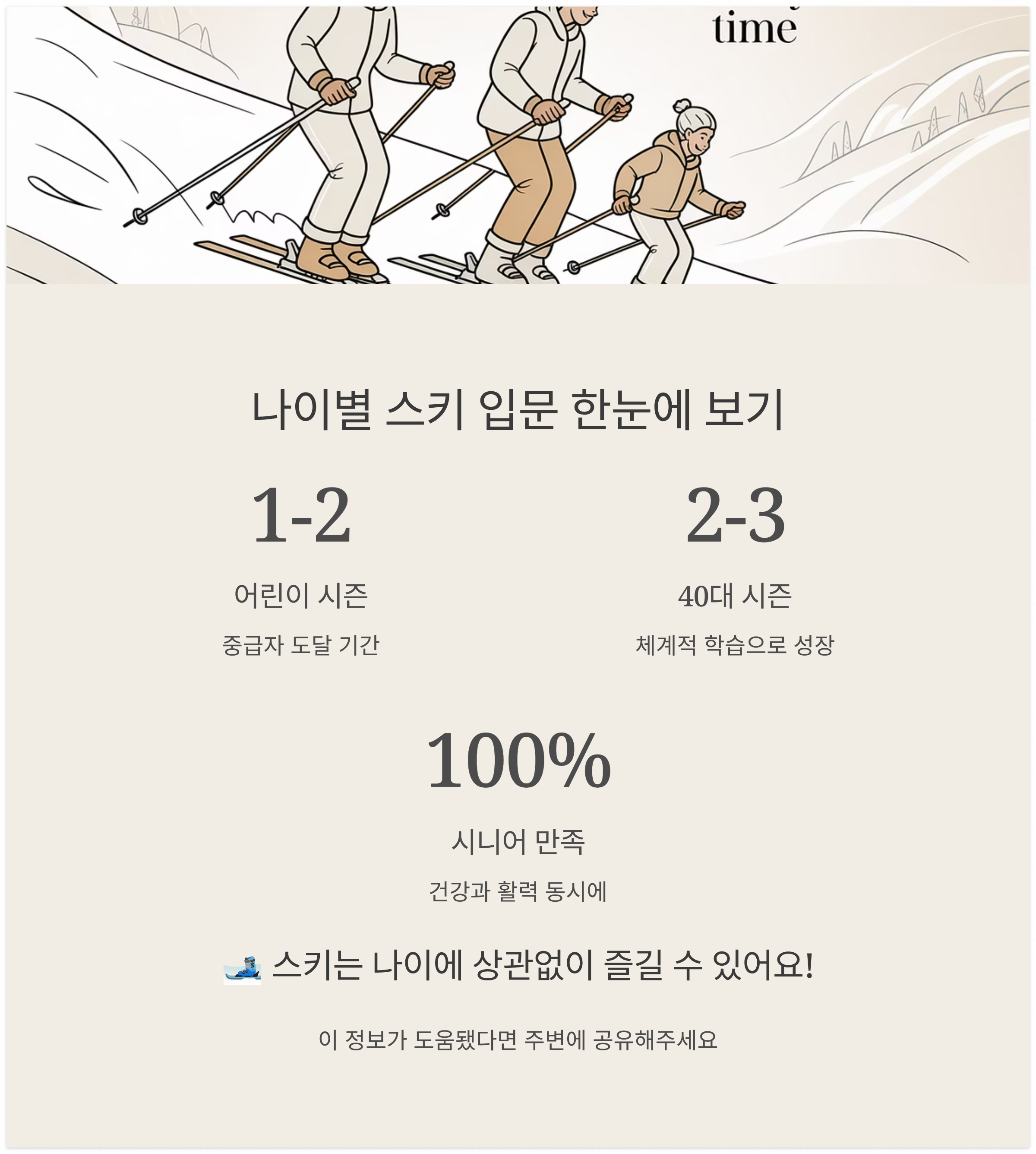 👉 시니어에게 스키는 “늦게 시작해도 즐길 수 있는 스포츠”입니다. 다만 건강을 최우선으로 두고 안전하게 접근해야 합니다.